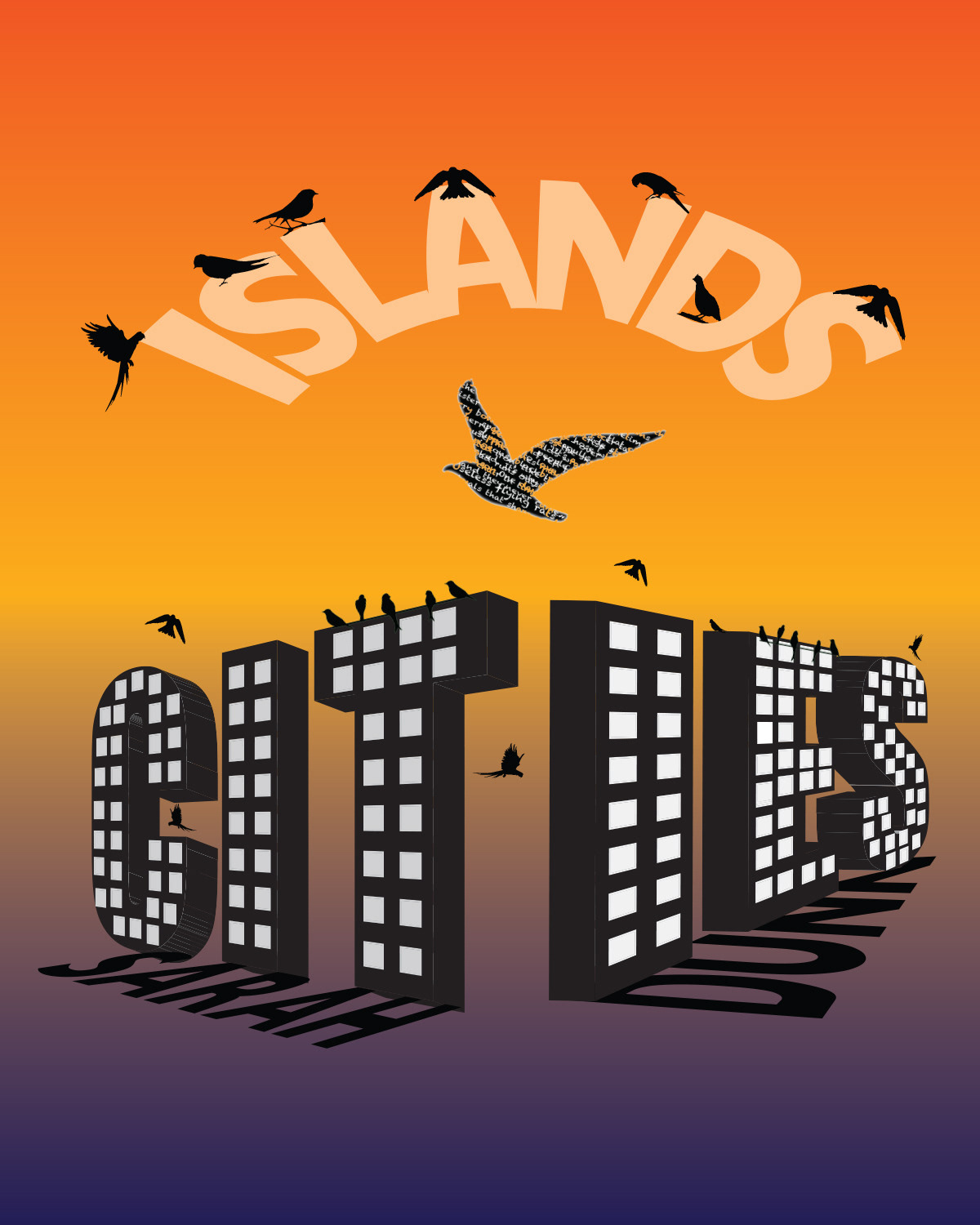 Island's and Cities was a short story created by Sarah Dunn. When reading the story it starts out being peaceful and serene but as it progresses it becomes really eerie. In my composition the gradient helps relay the idea of change over time. Change over time is represented by the blue gradient slowly waiting to eat up the whole cover to foreshadowing the upcoming unfortunate events told in the story. Imagery is the focal point using type as an image to communicate the idea for the shape of the a calm island and busy nature of a city. Plus the birds moving around the sky freely shows how free the birds are until the darkness looms over.